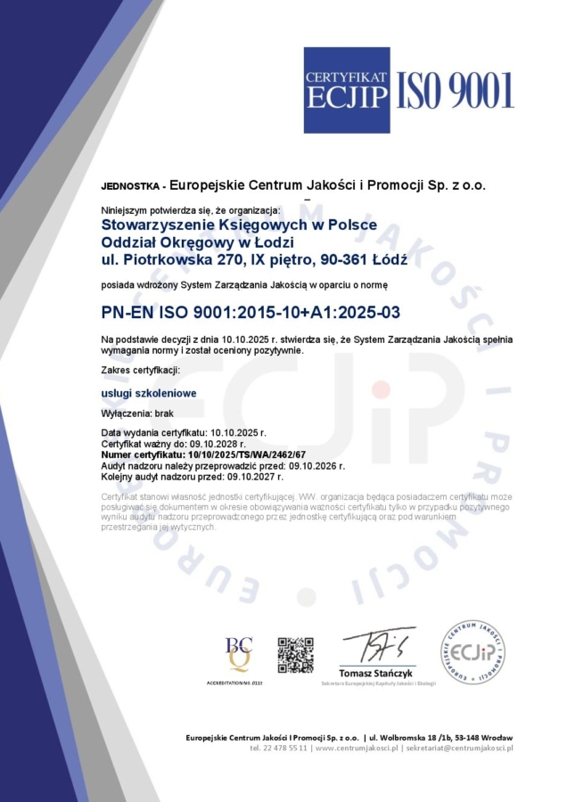 W Oddziale Okręgowym w Łodzi Stowarzyszenia Księgowych w Polsce został wdrożony System Zarządzania Jakością w oparciu o normę PN-EN ISO 001:2015-10+A1:2025-03.